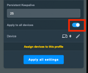 Navigate to “Advanced Settings”, then “VPN”, and “Profile” to activate the “Apply to all devices” switch. Thus, all connections are directed through the VPN interface. Finally, tap on “Apply all settings” to complete the setup.