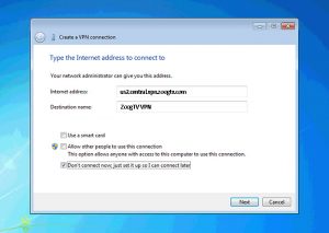 Type ‘Zoog VPN’ into the ‘Destination name’ field. Check the box ‘Don’t connect now; just set up so I can connect later’ and click ‘Next’ to continue.