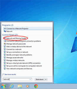 Click ‘Start’ and type ‘network’ into the search field. Click on ‘Network and Sharing Center’.