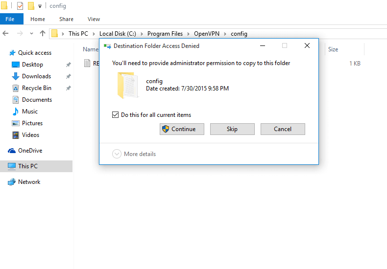 Download OpenVPN Configuration Files according to your VPN Plan and unzip them. Copy all files to the OpenVPN configuration folder (by default C:/Program Files/OpenVPN/config/) and confirm the Windows security messages.