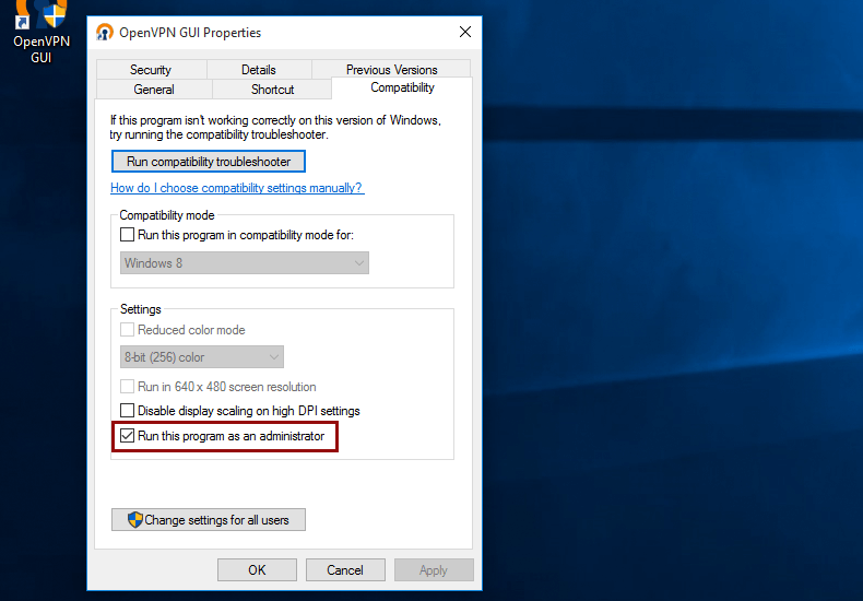 Click right on the OpenVPN desktop icon, click on ‘Settings’ and go to the tab ‘Compatibility’. Check ‘Run the program as an administrator’.