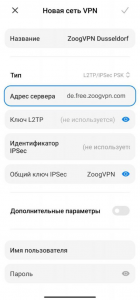 7. Далее выберите VPN-сервер, чтобы заполнить поле “Адрес сервера”. Вы можете найти все доступные адреса серверов в вашем аккаунте по этой ссылке. Например, адрес сервера может выглядеть так: de.free.zoogvpn.com