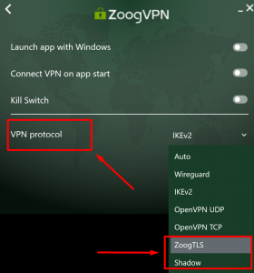 При возникновении проблем с подключением в ZoogVPN Windows приложении – пользователи могут сменить VPN протокол на Shadow или ZoogTLS и снова пользоваться беспроблемным подключением к VPN серверам.