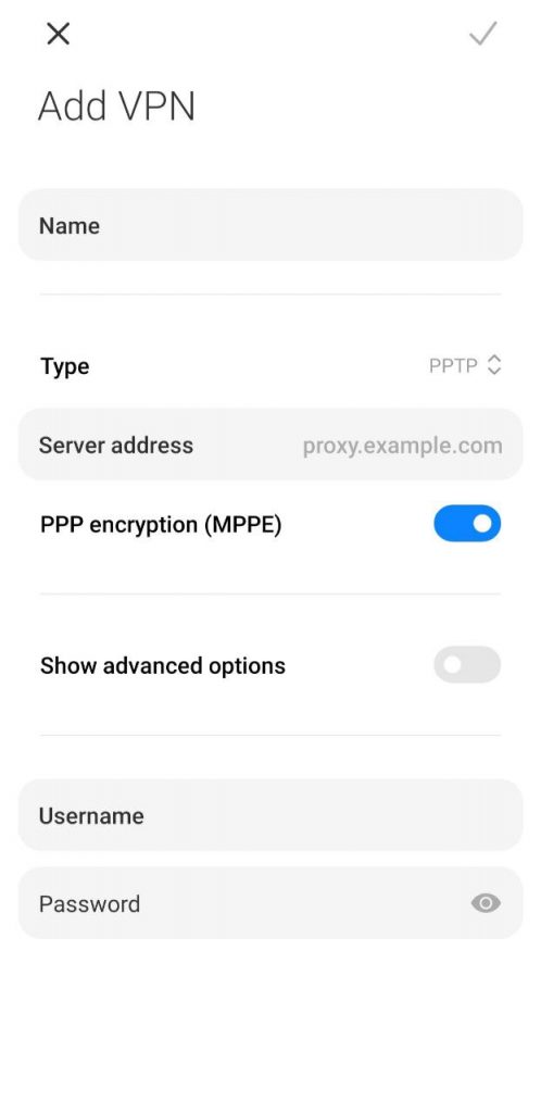 Шаг 3. Вводим данные от вашего VPN провайдера во все требуемые поля и подтверждаем кнопкой в верхнем правом углу.