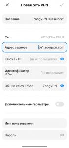 7. Далее выберите VPN-сервер, чтобы заполнить поле “Адрес сервера”. Вы можете найти все доступные адреса серверов в вашем аккаунте по этой ссылке. Например, адрес сервера может выглядеть так: nl.free.zoogvpn.com
