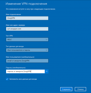 Важно обратить внимание, что поле “Имя или адрес сервера” меняется в зависимости от выбранного вами сервера. Адрес au1.zoogvpn.com был приведен в качестве примера. Все адреса серверов вы можете посмотреть вот тут.