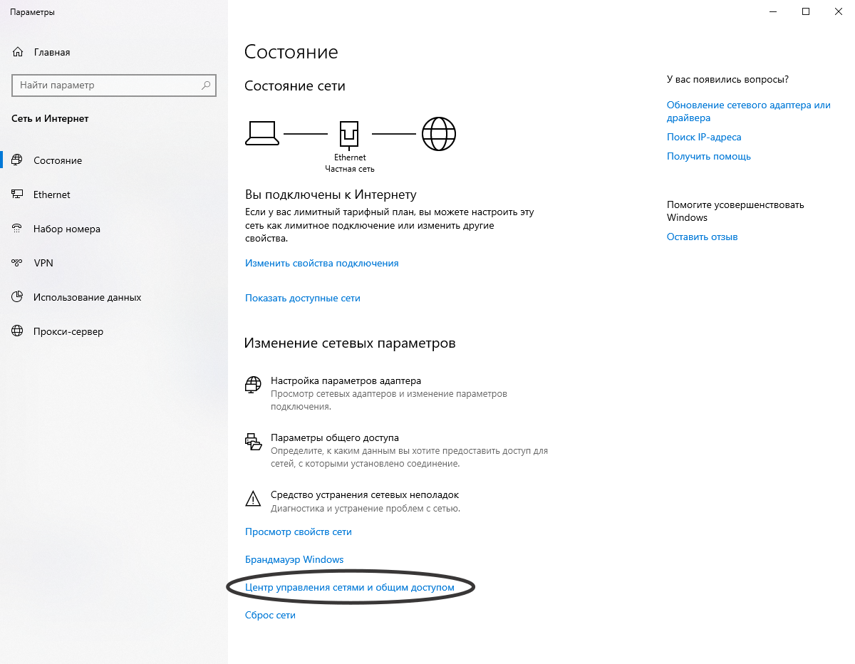 2. В открытом окне перейдите в пункт “Центр управления сетями и общим доступом”.