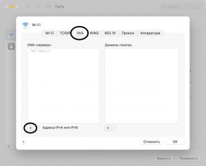 3. Выберите пункт DNS, и нажмите на значок плюс, как указано на скриншоте и введите желаемые адреса DNS-серверов. Например “8.8.8.8” или “8.8.8.4” для Google DNS.Выберите пункт DNS, и нажмите на значок плюс, как указано на скриншоте и введите желаемые адреса DNS-серверов. Например “8.8.8.8” или “8.8.8.4” для Google DNS.