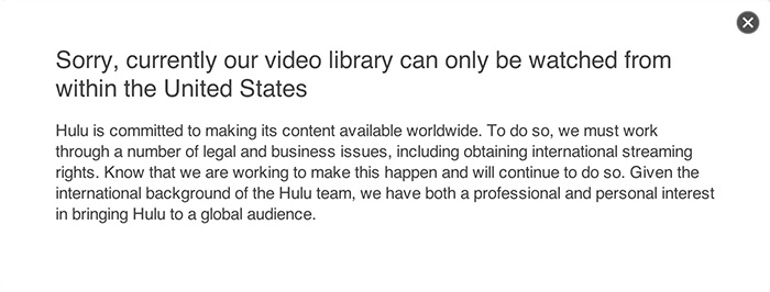 Unfortunately Hulu and their premium service Hulu Plus are only available in USA and it’s territories. Which means that in this day and age it is not possible to stream Hulu in Canada or Hulu in UK or anywhere else from outside USA. Anyone unfortunate enough to attempt Hulu.com from outside USA will come across a message that says “Sorry, currently our video library can only be watched from within the United States”.