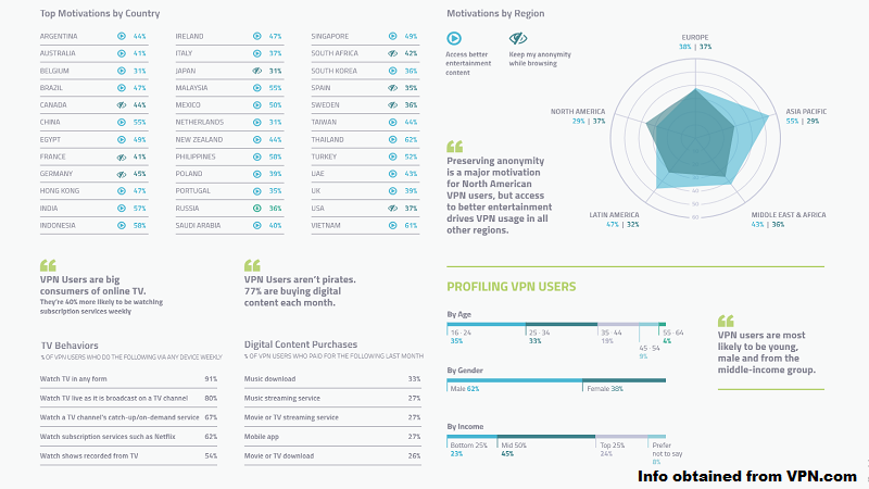 Motivations for using VPN services differ when it comes to Latin American or Pacific Asian countries, where people mostly use VPNs to get around geo-restrictions and access better entertainment content, such as Netflix or the iPlayer. What’s particularly interesting about this is that the majority of VPN users, 77% of them to be more precise, don’t use VPNs for pirating. They simply use it to get better digital content without any restrictions. In fact, an astonishing 91% of VPN users from these regions use VPN services to watch TV in any form.